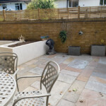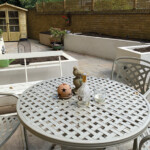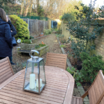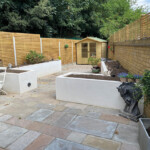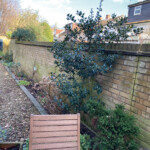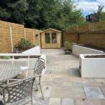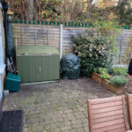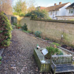 Development of a challenging garden with an unusual shape to incorporate storage, formal beds, and an entertaining area, all with low maintenance requirements.
